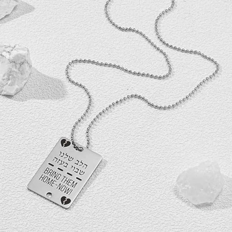 שרשרת דיסקית צבאית, עם חיתוך בלייזר של הכיתוב "הלב שלנו שבוי בעזה" ו-"BRING THEM HOME - NOW!", כאות הזדהות עם משפחות החטופים אשר יקיריהם מוחזקים בשבי החמאס.